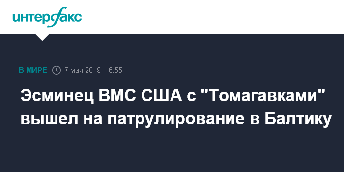 В настоящее время американский эсминец, оснащенный крылатыми ракетами "Томагавк" с дальностью действия 1,6 тыс. км, идет по Рижскому заливу курсом на Центральную Балтику.