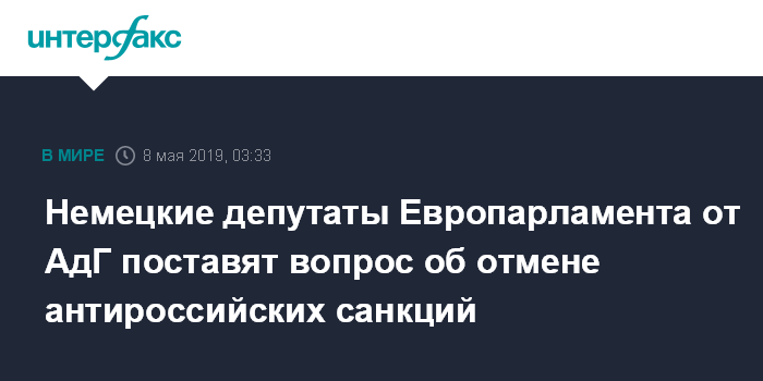 Москва. 8 мая. INTERFAX.RU - Депутат от партии "Альтернатива для Германии" (АдГ), член комитета по международным делам бундестага Вальдемар Гердт заявил, что в случае победы АдГ и ее союзников из других стран на майских выборах в Европарламент (ЕП), они поднимут вопрос об отмене санкций против России.