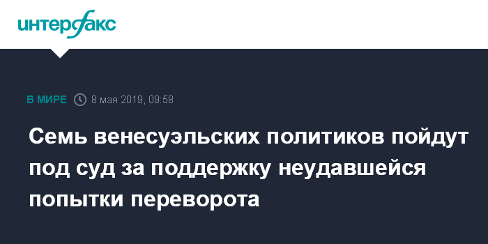 Москва. 8 мая. INTERFAX.RU - Власти Венесуэлы привлекут к ответственности семерых представителей законодательной власти, которые на прошлой неделе поддержали неудавшийся военный переворот, организованный лидером оппозиции Хуаном Гуайдо, сообщают в среду западные СМИ.
