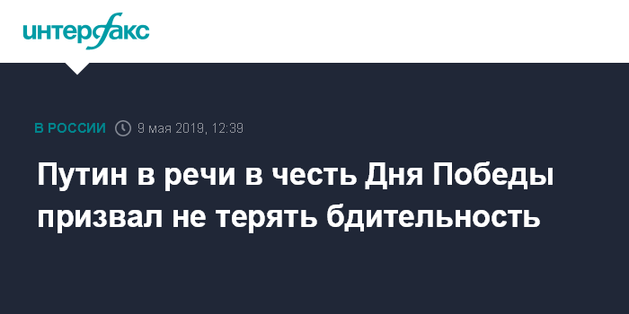 Москва. 9 мая. INTERFAX.RU - Президент Владимир Путин назвал День Победы мерилом "совести и гордости" для народа России, напоминанием о необходимости быть бдительными.