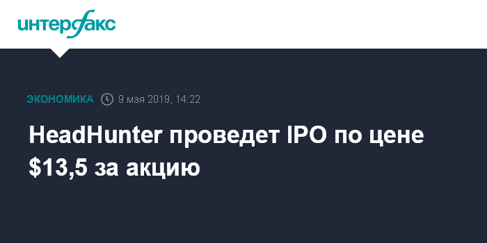 Москва. 9 мая. INTERFAX.RU - Рекрутинговый сервис HeadHunter установил цену размещения акций в рамках предстоящего IPO в $13,5 за ценную бумагу, говорится в материалах компании. Цена размещения была установлена по верхней границе ценового диапазона, который изначально составлял $11-13,5 за ценную бумагу.