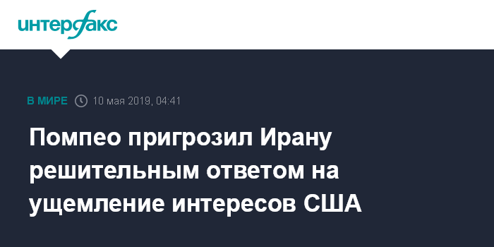 Москва. 10 мая. INTERFAX.RU - Любые шаги Ирана, направленные против интересов США, вызовут ответные действия со стороны Вашингтона, заявил американский госсекретарь Майк Помпео.