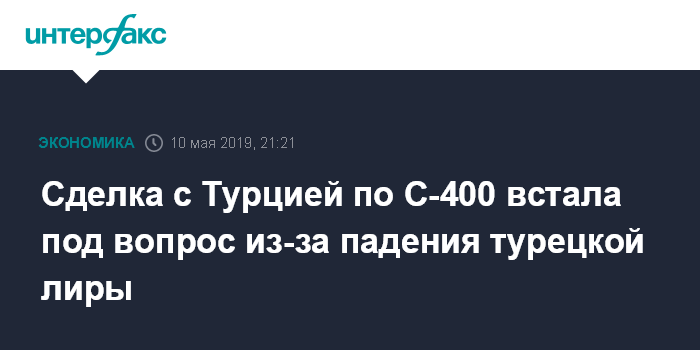 Москва. 10 мая. INTERFAX.RU - В связи с ситуацией с турецкой лирой, Турция может пересмотреть сделку с Россией о приобретении зенитно-ракетных комплексов С-400, сообщило в пятницу немецкое издание Das Bild со ссылкой на дипломатические источники в Анкаре.