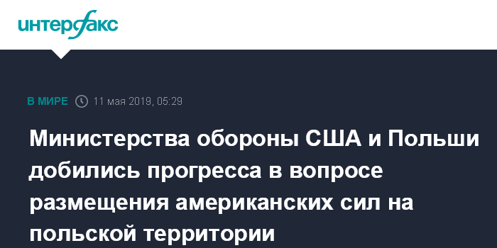 Москва. 11 мая. INTERFAX.RU - Военные ведомства США и Польши в ходе состоявшихся в Вашингтоне переговоров заместителей министров обороны двух стран Джона Руда и Томаша Шатковского добились прогресса в вопросе наращивания численности американских военных на польской территории, сообщил Пентагон в ночь на субботу.