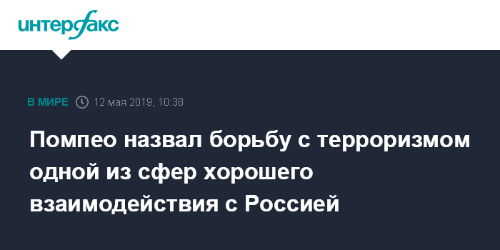 Москва. 12 мая. INTERFAX.RU - Госсекретарь США Майк Помпео положительно оценил опыт взаимодействия с Россией по таким темам, как ситуация в Сирии, в Афганистане и Венесуэле, а также по противодействию терроризму.
