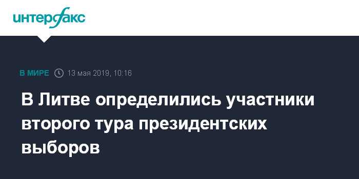 Москва. 13 мая. INTERFAX.RU - Во втором туре президентских выборов в Литве встретятся член сейма, бывший министр финансов и кандидат от консерваторов Ингрида Шимоните и экономист, бывший советник президента банка SEB bankas Гитанас Науседа.