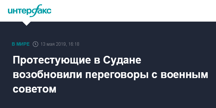 Москва. 13 мая. INTERFAX.RU - Участники акций протеста в Судане возобновили переговоры с представителями взявшего на себя управление страной военного совета, сообщает агентство Associated Press.