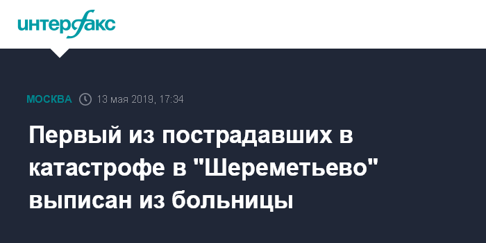 Москва. 13 мая. INTERFAX.RU - Первый из пострадавших в результате возгорания самолета в московском аэропорту "Шереметьево" выписан из клиники ФМБА, сообщили в пресс-службе медучреждения.