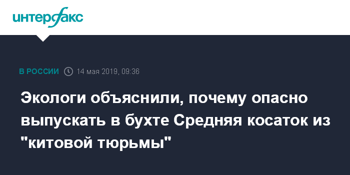 Москва. 14 мая. INTERFAX.RU - Экологи сообщили о планах властей выпустить косаток из "китовой тюрьмы" в бухте Средняя, где сейчас находятся животные, и заявляют, что это опасно для них.