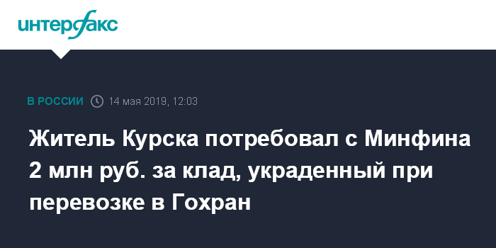 Житель Курска потребовал с Минфина 2 млн руб. за клад, украденный при перевозке в Гохран