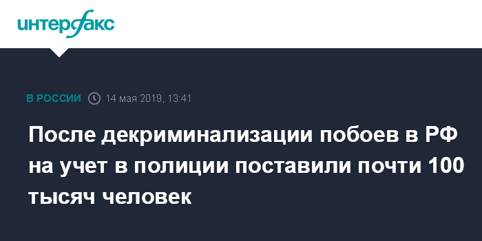 Москва. 14 мая. INTERFAX.RU - Число россиян, оказавшихся на полицейском учете за дебоши после декриминализации побоев, приближается к 100 тысячам человек.