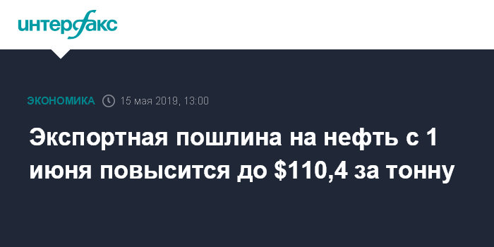 Москва. 15 мая. INTERFAX.RU - Экспортная пошлина на нефть в РФ с 1 июня 2019 года составит $110,4 за тонну, говорится в материалах на сайте Минфина РФ.