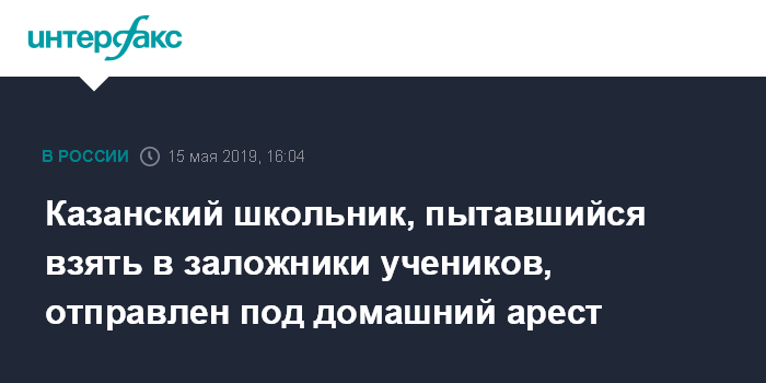 Москва. 15 мая. INTERFAX.RU - Ново-Савиновский районный суд Казани отправил под домашний арест школьника, который вооружившись пистолетом и ножом, удерживал одноклассников в классе, сообщает корреспондент агентства "Интерфакс" из суда.