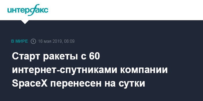 Москва. 16 мая. INTERFAX.RU - Планировавшийся в четверг запуск американской ракеты-носителя Falcon 9 на орбиту с 60 мини-спутниками, предназначенными для начала создания глобальной сети интернет-покрытия системы Starlink, перенесен на сутки в связи с неблагоприятными погодными условиями, сообщила компания-разработчик SpaceX.