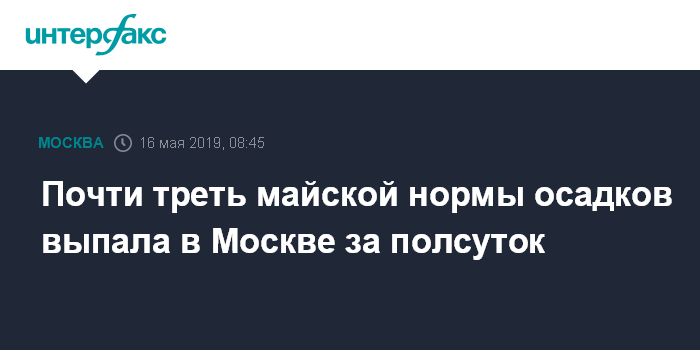 Москва. 16 мая. INTERFAX.RU - Продолжавшийся около половины суток в Москве дождь на базовой метеостанции на ВДНХ дал прирост 15 мм осадков, что составляет почти треть от месячной нормы, сообщили "Интерфаксу" в среду в столичном метеобюро.