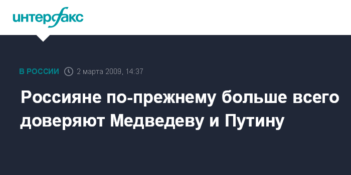По его словам, в январе 2008 г. 34% опрошенных россиян называли Медведева политиком, которому они больше всего доверяют, в марте 2008 г. - 39%, в сентябре - 45%, в ходе опроса 21-22 февраля 2009 г. - также 45%.