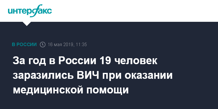 Москва. 16 мая. INTERFAX.RU - За 2018 год в России 19 человек заразились ВИЧ при оказании медицинской помощи, сообщила в четверг представитель Роспотребнадзора Разина Айзатулина.