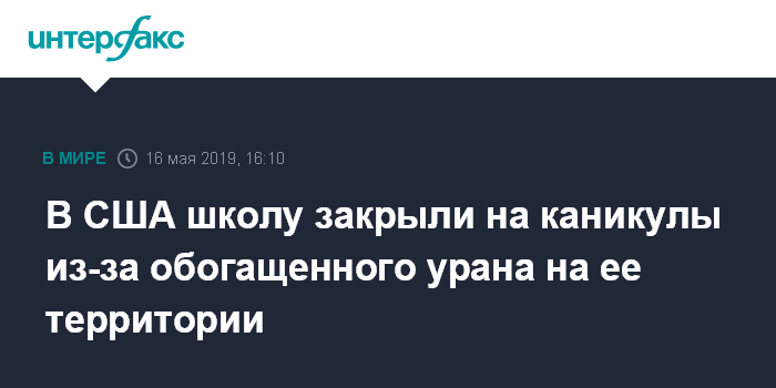 Москва. 16 мая. INTERFAX.RU - Учеников школы в американском штате Огайо отпустили на летние каникулы почти на неделю раньше после того, как на ее территории обнаружили радиоактивные материалы, сообщает телеканал Fox News.