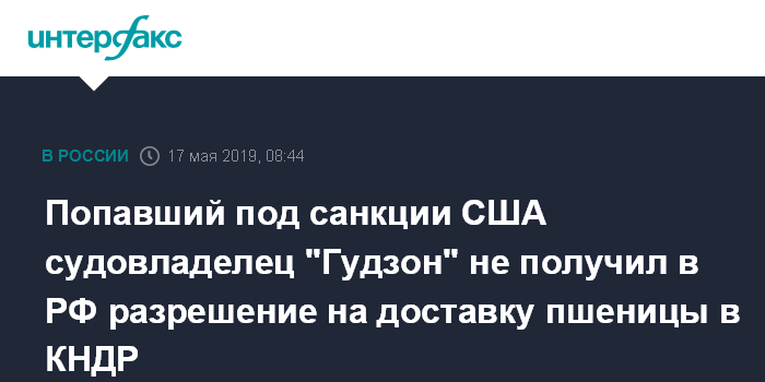 Москва. 17 мая. INTERFAX.RU - Росморречфлот не выдал теплоходу "Белла", принадлежащему попавшей под санкции США судоходной компании "Гудзон", разрешение, необходимое для доставки в КНДР гуманитарного груза - 3 тысяч тонн пшеницы, сообщил замгендиректора компании Валерий Улискин.