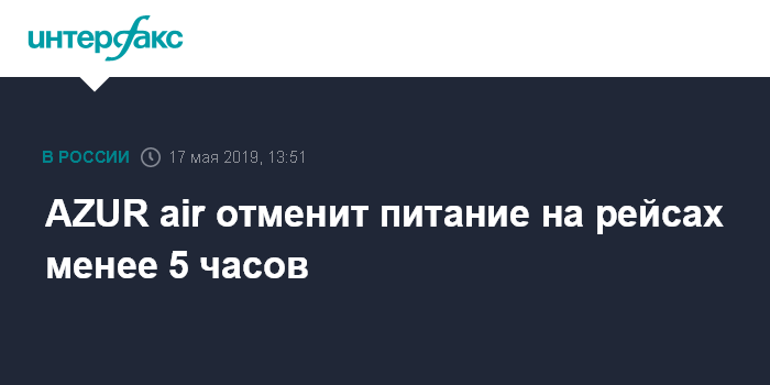 Москва. 17 мая. INTERFAX.RU - Авиакомпания AZUR air с 1 июня отменяет питание на всех рейсах длительностью менее 5 часов, сообщил "Интерфаксу" представитель перевозчика.