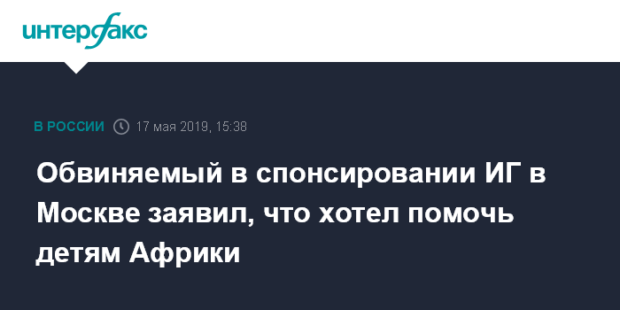 Москва. 17 мая. INTERFAX.RU - Гражданин РФ, 26-летний уроженец Северной Осетии Георгий Гуев, задержанный по делу о перечислении боевикам запрещенного в России "Исламского государства" 50 млн рублей, заявил в суде, что собирался помочь африканским детям.
