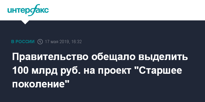 Москва. 17 мая. INTERFAX.RU - На проект "Старшее поколение будет потрачено порядка 100 млрд рублей, главный акцент программы - на продлении активного периода жизни пожилых людей, заявил премьер-министр РФ Дмитрий Медведев.