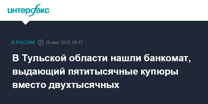 Москва. 20 мая. INTERFAX.RU - Тульский банкомат по ошибке выдавал пятитысячные купюры вместо двухтысячных, что позволило местным жителям обогатиться почти на 300 тысяч рублей, сообщили в понедельник в региональном управлении МВД.