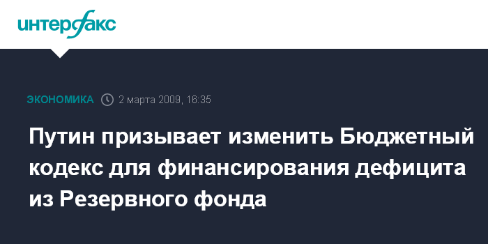 Москва. 2 марта. INTERFAX.RU - Премьер-министр РФ Владимир Путин призывает внести изменения в Бюджетный кодекс в связи с необходимостью финансировать дефицит бюджета 2009 года из Резервного фонда.