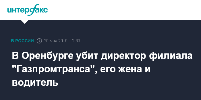 Москва. 20 мая. INTERFAX.RU - Следственные органы возбудили уголовное дело по факту убийства троих человек в Оренбурге. Один из убитых - глава оренбургского филиала транспортной "дочки" ПАО "Газпром" - ООО "Газпромтранс" - Андрей Бахарев.