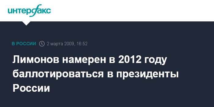 Москва. 2 марта. INTERFAX.RU - Один из лидеров оппозиционной коалиции "Другая Россия" Эдуард Лимонов собирается участвовать в президентских выборах в 2012 году.