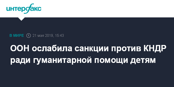 Москва. 21 мая. INTERFAX.RU - Совбез ООН временно ослабил санкции против КНДР для того, чтобы ЮНИСЕФ (Детский фонд ООН) смог реализовать свои гуманитарные программы в стране, сталкивающейся с нехваткой продовольствия, сообщает южнокорейское агентство "Рёнхап" со ссылкой на ООН.