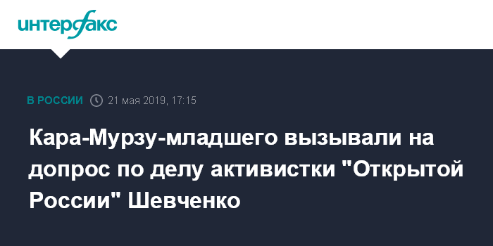 Москва. 21 мая. INTERFAX.RU - Председателя Фонда Бориса Немцова Владимира Кара-Мурзу-младшего вызвали в Следственный комитет на допрос в качестве свидетеля по делу ростовской активистки "Открытой России" Анастасии Шевченко, сообщил "Интерфаксу" его адвокат Вадим Прохоров.