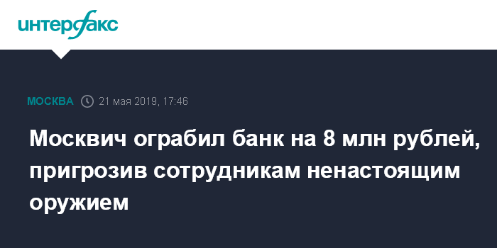 Москвич ограбил банк на 8 млн рублей, пригрозив сотрудникам ненастоящим оружием