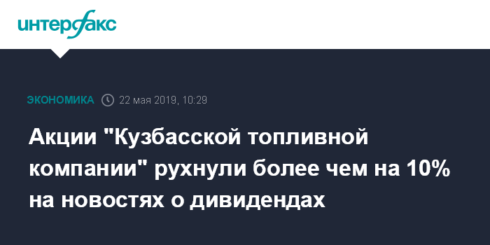 Москва. 22 мая. INTERFAX.RU - Акции "Кузбасской топливной компании" (КТК) утром в среду рухнули на бирже более чем на 10% на новостях о возможной невыплате дивидендов за 2018 год.