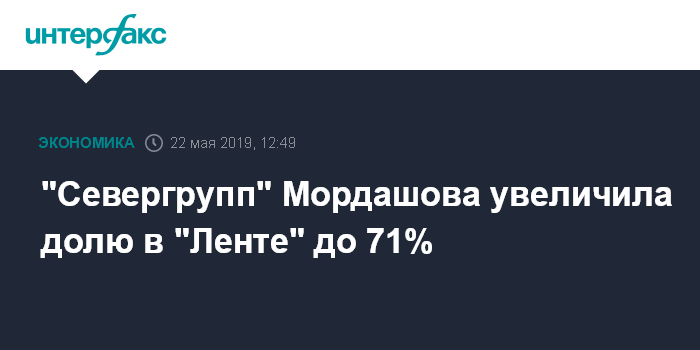 Москва. 22 мая. INTERFAX.RU - "Севергрупп" Алексея Мордашова увеличила долю в "Ленте" до 70,95% с 59,17%. Изменение доли произошло 21 мая, сообщил ритейлер.