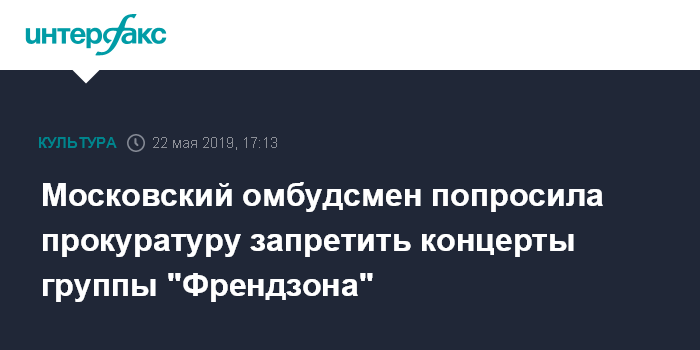 Москва. 22 мая. INTERFAX.RU - Московский уполномоченный по правам человека Татьяна Потяева обратилась в прокуратуру с просьбой запретить проведение в столице концертов группы "Френдзона", сообщили в среду в столичном департаменте труда и соцзащиты.