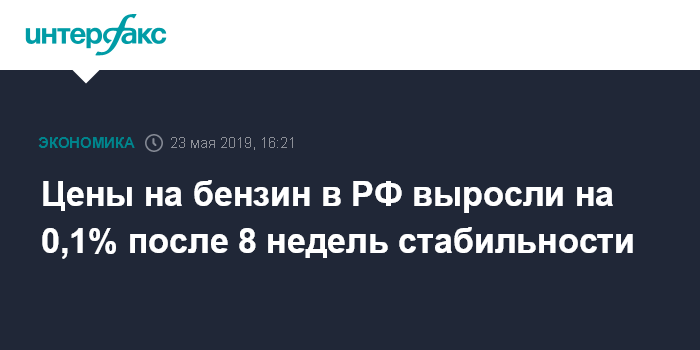 Москва. 23 мая. INTERFAX.RU - Потребительские цены на бензин в России с 13 по 20 мая выросли на 0,1% после восьми недель стабильности, сообщила Федеральная служба государственной статистики (Росстат) в четверг.