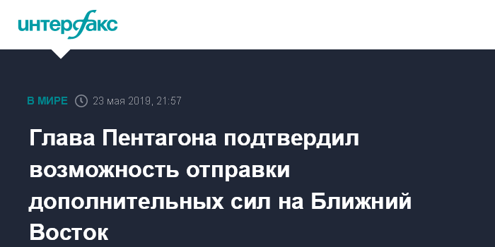 Москва. 23 мая. INTERFAX.RU - США действительно могут направить на Ближний Восток дополнительные силы, заявил в четверг исполняющий обязанности главы Пентагона Патрик Шанахан.