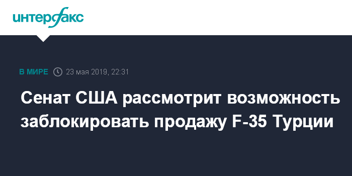 Москва. 23 мая. INTERFAX.RU - Комитет сената США по делам вооруженных сил сообщил, что включил в одобренный им законопроект о военном бюджете на 2020 год предложение об отказе в продаже Турции истребителей-бомбардировщиков F-35, если она приобретет у России системы ПВО С-400.