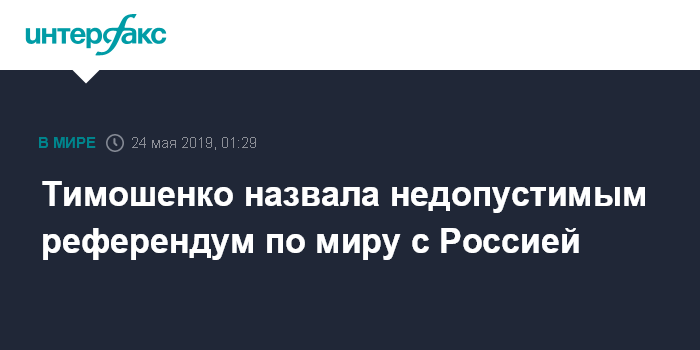 Москва. 24 мая. INTERFAX.RU - Лидер объединения "Батькивщина" Юлия Тимошенко заявила, что референдум вопроса о заключении мирных договоренностей с Россией недопустим.
