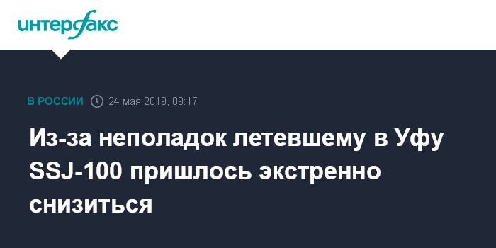 Москва. 24 мая. INTERFAX.RU - Сбой в системе предупреждения опасного сближения вынудил пассажирский Superjet экстренно снизиться над Уралом, после чего полет продолжился на минимальной высоте.