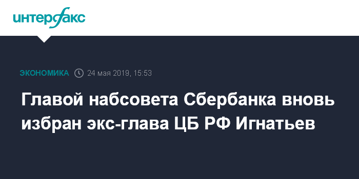 Москва. 24 мая. INTERFAX.RU - Председателем наблюдательного совета Сбербанка России по итогам его заседания вновь избран экс-глава ЦБ РФ Сергей Игнатьев. Об этом сообщил журналистам сам Игнатьев.