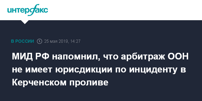 Москва. 25 мая. INTERFAX.RU - МИД РФ заявил, что инцидент с украинскими судами в районе Керченского пролива не входит в юрисдикцию международного арбитража и что Конвенция ООН по морскому праву не может быть задействована при разрешении спора Москвы и Киева по этому инциденту.