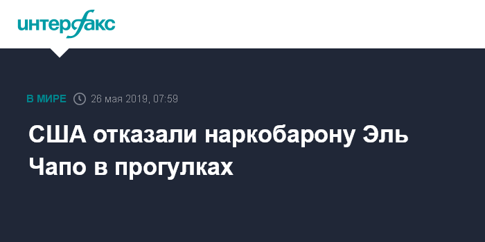 Москва. 26 мая. INTERFAX.RU - Американские власти лишили права на прогулки признанного виновным мексиканского наркобарона Хоакина Гусмана по прозвищу Эль Чапо, сообщил в воскресенье телеканал CNN.
