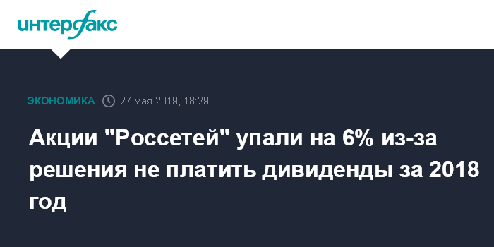Москва. 27 мая. INTERFAX.RU - Акции "Россетей" вечером в понедельник упали на 6% после известий, что совет директоров рекомендовал не выплачивать дивиденды за 2018 год в связи с убытком.