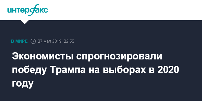 Москва. 27 мая. INTERFAX.RU - Специалисты в области экономики считают, что нынешний президент США Дональд Трамп имеет большие шансы на переизбрание на выборах 2020 года, сообщает в понедельник американская газета The New York Times. По данным издания, эксперты основывают такой вывод на экономической модели, которая ранее использовалась для прогнозирования результатов на выборах экс-президента США Барака Обамы.