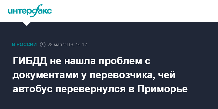 Москва. 28 мая. INTERFAX.RU - ГИБДД не выявила нарушений в документах компании-перевозчика, автобус которой перевернулся в Приморье при перевозке китайских туристов, сообщила пресс-служба краевого УМВД.