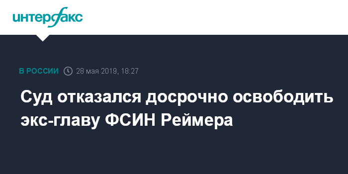 Москва. 28 мая. INTERFAX.RU - Центральный суд Калининграда отказал в условно-досрочном освобождении (УДО) бывшему главе Федеральной службы исполнения наказаний (ФСИН) России Александру Реймеру, осужденному на восемь лет, говорится в материалах картотеки суда.
