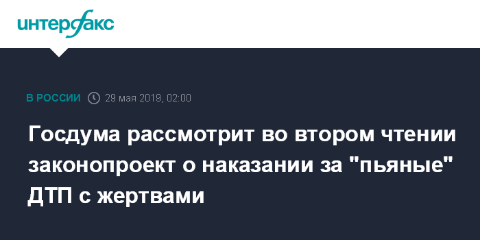 Ранее еще один автор законопроекта, председатель комитета Госдумы по безопасности Василий Пискарев отметил, законопроектом предлагается приравнять ответственность за ДТП в состоянии опьянения, в котором погибли люди, к ответственности за умышленное убийство.