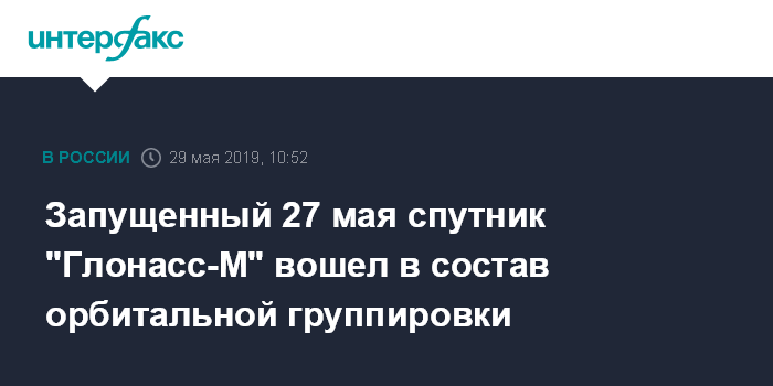 Москва. 29 мая. INTERFAX.RU - Космический аппарат (КА) "Глонасс-М", успешно выведенный на орбиту в понедельник ракетой "Союз", вошел в состав спутниковой группировки системы "ГЛОНАСС". Об этом сообщает Информационно-аналитический центр координатно-временного и навигационного обеспечения.